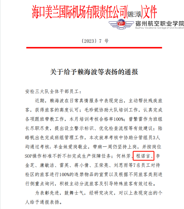 程诺言时时刻刻谨记岗位职责,坚守岗位底线📔,始终坚持岗位操作流程,不排除疑点绝不放过🫰🏼,用自己的责任心书写着对安检工作的热爱。凭借自己认真负责🔅、细致入微的工作态度,程诺言也收获了旅客的点赞及安检站表彰。