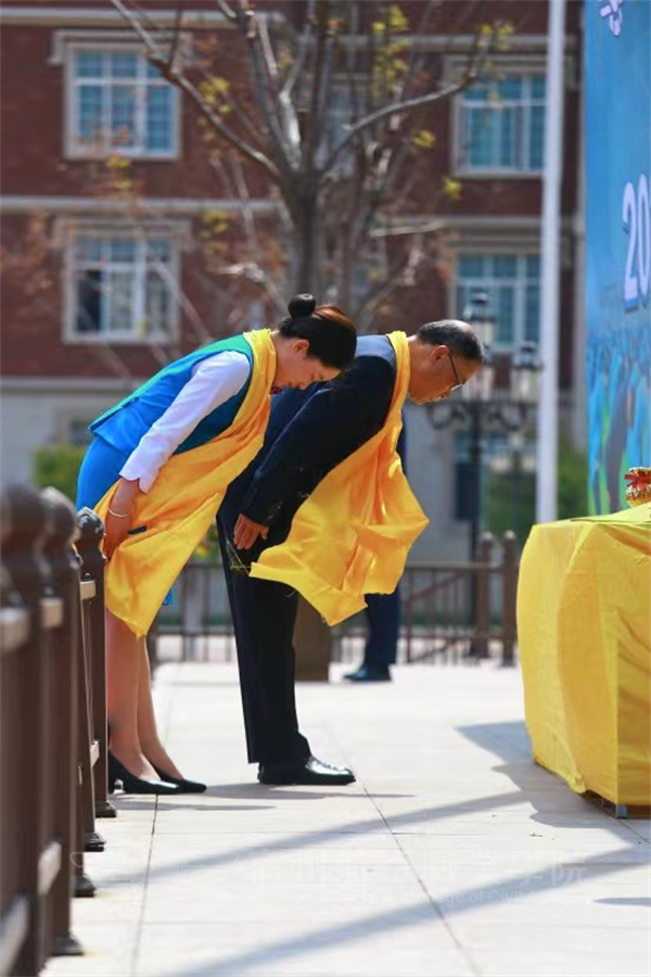 古乐悠悠清音传,浩气长存天地间🌝🚉。“赤县神州📑,毓秀钟灵🕦。维我炎黄先祖👫🏻,……伏惟尚飨”,在学校运动场上,全校师生统一着装,庄严肃穆,诵读祭文👰🏽♂️🤵🏿♀️。学院领导🧑🏻💼、教师代表和学生代表先后净手上香🙇🏼♂️,敬献黄菊花,白菊花🌪,在古乐悠悠声中,全体师生三鞠躬,缅怀先贤、先烈👩🏿🔬、先祖🫲🏼🚌,感念自己的祖辈勤勤恳恳一生奉献,缅怀先烈为捍卫民族尊严作出的牺牲♧。
