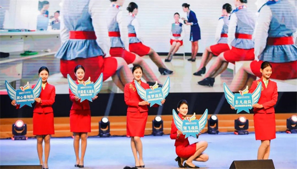 在参赛队以及展示队的精彩亮相环节🪯,各大战队身着职业装在万众期待下一一登台。整齐划一的的口号、挺拔靓丽的风姿、透露着自信的微笑ℹ️,无一不彰显着民航职业院校空乘学子们的魅力与个性👩👩👧👧🗾、气质与风采。