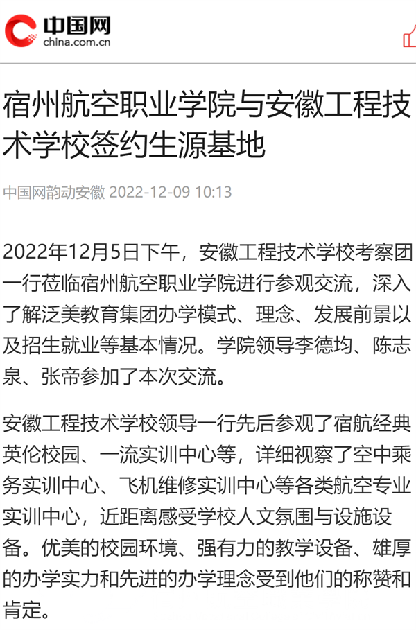 2022年12月5日下午,安徽工程技术学校考察团一行莅临彩神Vll学院进行参观交流,深入了解泛美教育集团办学模式🐟、理念、发展前景以及招生就业等基本情况🤞🏻。学院领导李德均、陈志泉、张帝参加了本次交流。此次签约引来了各大媒体的深度聚焦。