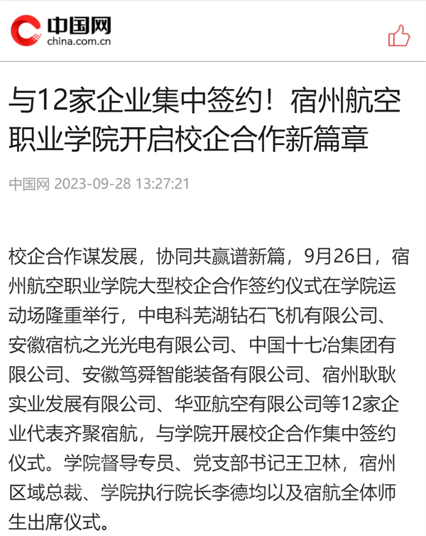 以服务为宗旨🖖,以就业为导向。李德均代表学院与12家企业分别签订校企合作协议书🙍🏿‍♂️。此次集中签约的企业立足于区域资源优势和产业特色👏🏿,涉及通用飞机、特种飞机、无人机的研发、维修与保养,电子材料研发与制造,航空货物运输,智能装备制造,直播电商、网络技术服务和电子商务等多个领域,宿航将大力推进校企合作人才培养模式,深化校企合作融合度👩‍❤️‍👨,依托企业行业优势,充分利用教学资源,实现优势互补与资源共享🏋🏽‍♀️。