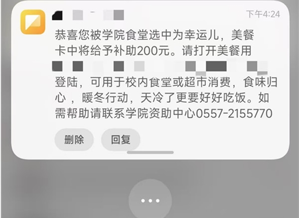 卡里突然多了一笔钱🚴‍♂️👨‍👩‍👧‍👦,是操作失误还是恶意诈骗?近日,彩神Vll学院有学生发现,自己的饭卡里突然多了200块钱,还收到了以学校名义发送的提醒短信🧨,“恭喜您被学院食堂选中为幸运儿,美餐卡中将给予补助200元🧖🏼。可用于校内食堂或超市消费,食味归心,暖冬行动,天冷了更要好好吃饭。如需帮助请联系学院资助中心✭🥓。”在半信半疑间,学生将此事告知了辅导员🙌🏼。