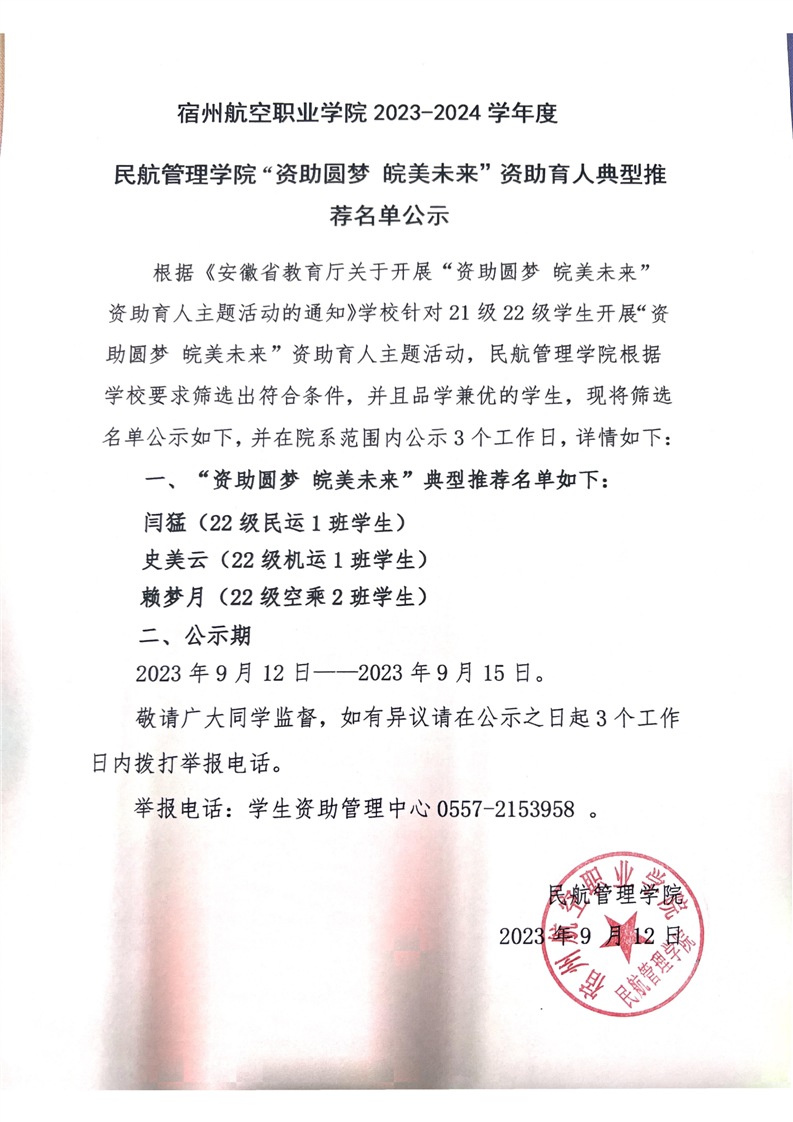 彩神Vll学院2023-2024学年度民航管理学院“资助圆梦 皖美未来”资助育人典型推荐名单公示