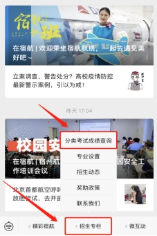 2.进入公众号后点击下方“招生专栏”,之后点击上方“分类考试成绩查询”,进入查询页面;