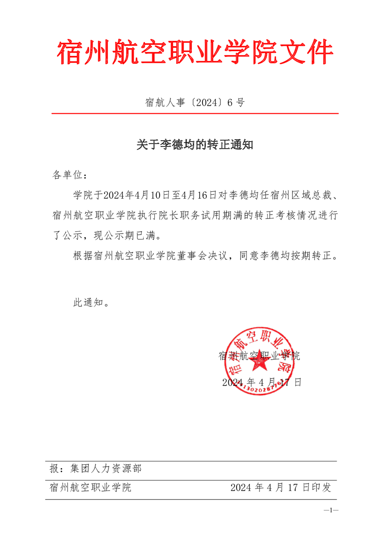 关于李德均的转正通知宿航人事
