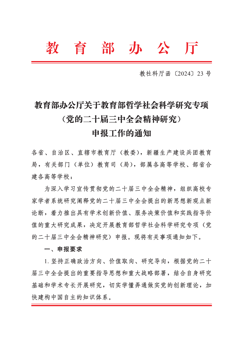 教育部办公厅关于教育部哲学社会科学研究专项(党的二十届三中全会精神研究)申报工作的通知