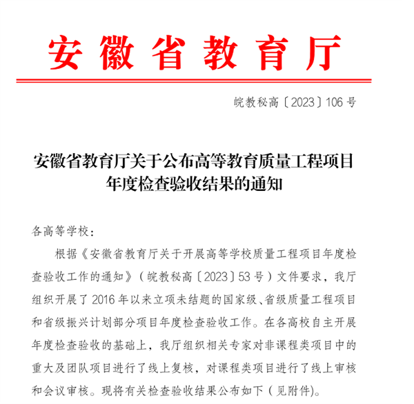 为提高各级各类高校质量工程项目建设质量,2023年安徽省教育厅组织专家对省级质量工程项目进行年度检查验收。近日,安徽省教育厅公布了高等教育质量工程项目年度检查验收结果,我院接受检查验收的3项省级质量工程项目经学校组织专家检查验收🧛‍♀️,报安徽省教育厅审核,通过阶段检查💆‍♂️🕑,其中良好两个🧯🤦🏻‍♀️,合格一个👨🏻‍🦱。