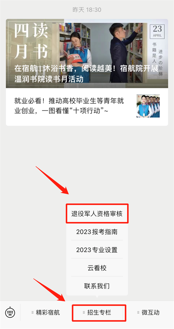 2.进入公众号后点击“招生专栏”,点击上方“退役军人资格审核”👤🧓🏻;