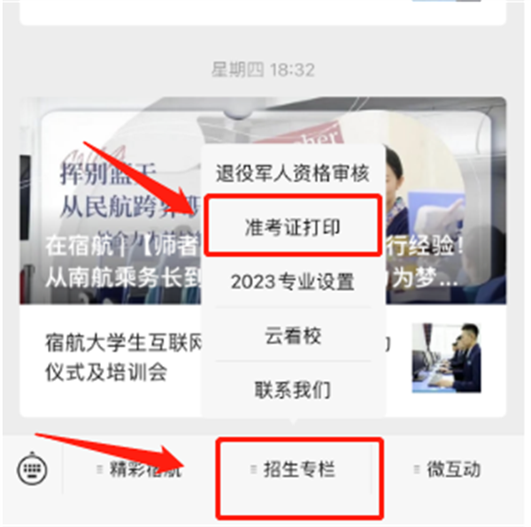 2.进入公众号后点击下方“招生专栏”,之后点击上方“准考证打印”,进入准考证查询页面;