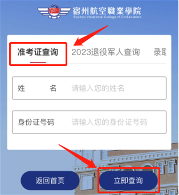 3.进入后点击“准考证查询”,根据提示填写“姓名”及“身份证号码”,核实无误后🖋,点击下方“立即查询”,即可查看准考证👩🏿‍🔬;