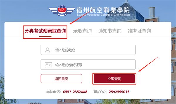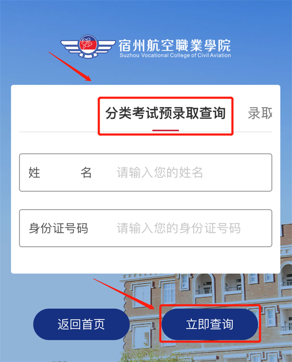 2.进入后点击“分类考试预录取查询”,根据提示填写学生“姓名”及“身份证号码”📗,填写正确后🕵🏼⛈,点击下方“立即查询”👌;