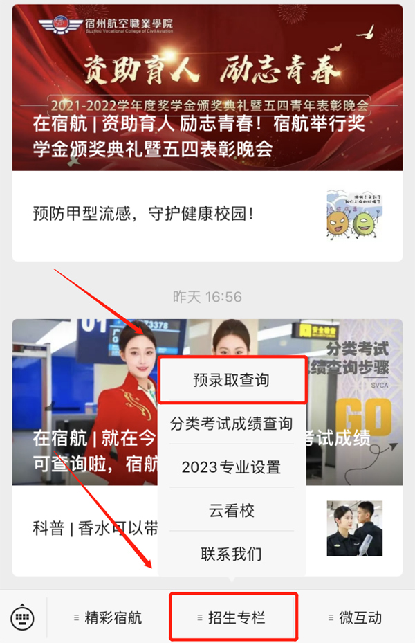 2.进入公众号后点击下方“招生专栏”,之后点击上方“预录取查询”,进入查询页面;