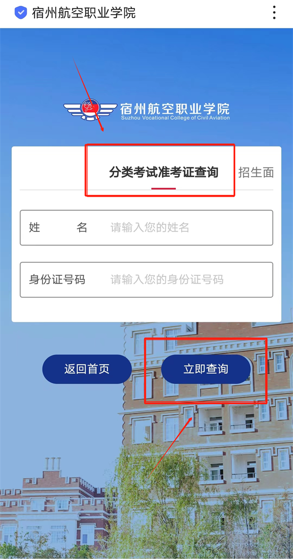 2.进入后点击“分类考试准考证查询”,根据提示填写学生姓名及身份证号码,填写正确后💨,点击下方“立即查询”👨🏽🍼🧸;