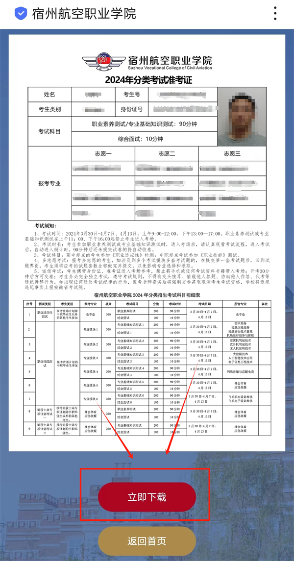 4.点击“立即查询”后,即可查看准考证信息,请考生仔细核对个人信息👩🏭,核对无误后🥴,点击下方“立即下载”,下载准考证。