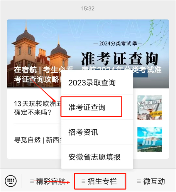 2.进入公众号后点击下方“招生专栏”🧗,之后点击上方“准考证查询”🙎🏻♀️,进入查询页面🕵🏽♂️🤦🏻♀️;