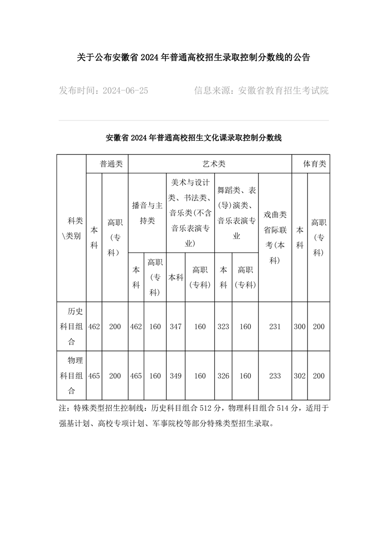 关于公布安徽省2024年普通高校招生录取控制分数线的公告