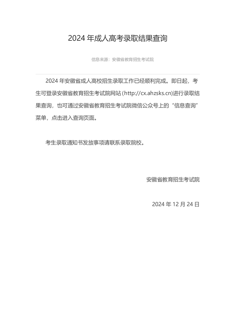 2024年安徽省成人高校招生录取工作温馨提示