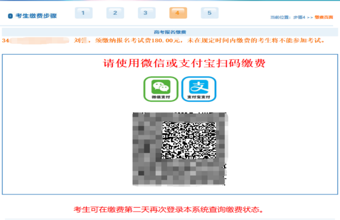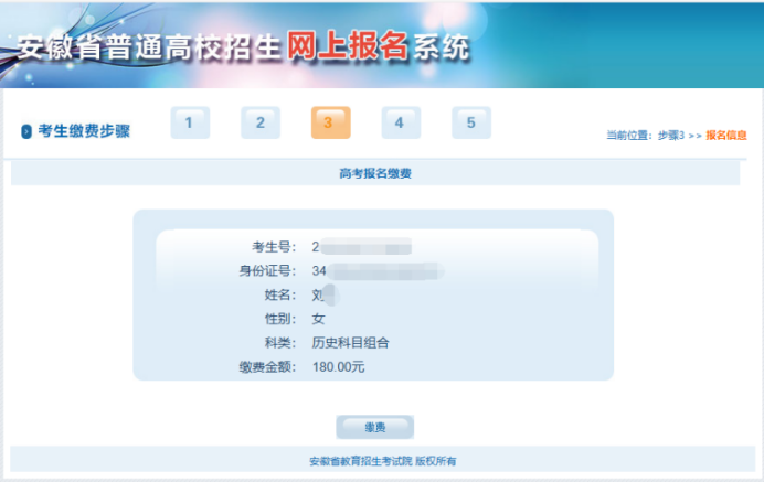 3.仔细核对考生信息并确认无误后♧,点击“缴费”按钮,进行缴费。考生缴费金额由系统自动根据考生是否参加分类、对口考试等条件自动计算🎼,不同考生缴费金额可能不同。