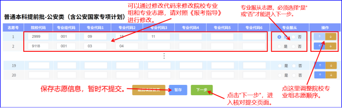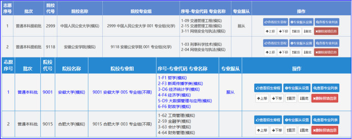 2.导入后,填报的志愿以代码的形式显示,这时候可以进行修改、调整顺序等: