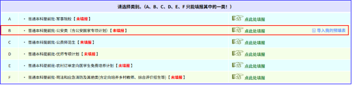 小王同学填报的院校专业组属于“普通本科提前批-公安类(含公安国家专项计划)”,因为已经在志愿填报辅助系统中预填了志愿🩸,可以直接点击对应项后的“导入我的预填表”🤧: