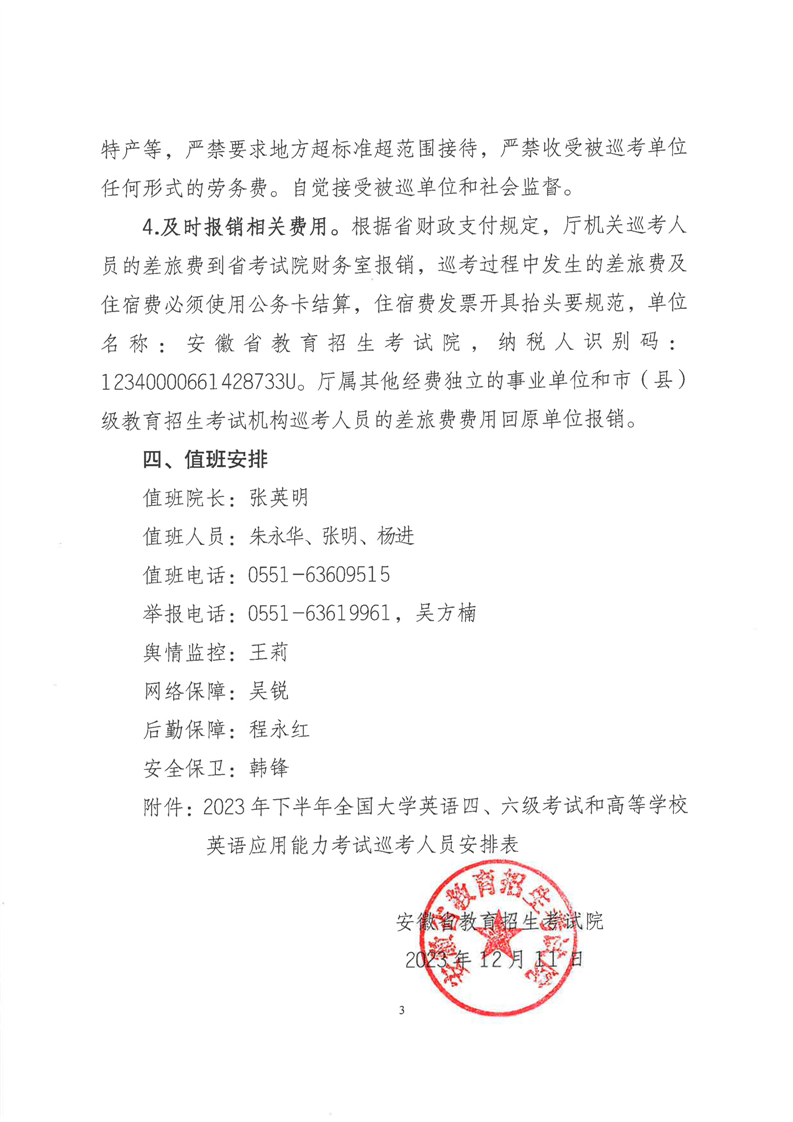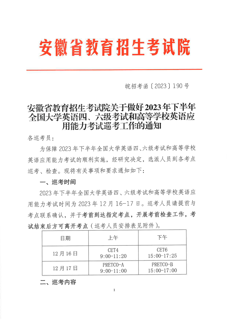 安徽省教育招生考试院关于做好2023年下半年全国大学英语四🏌🏼♂️、六级考试和高等学校英语应用能力考试巡考工作的通知