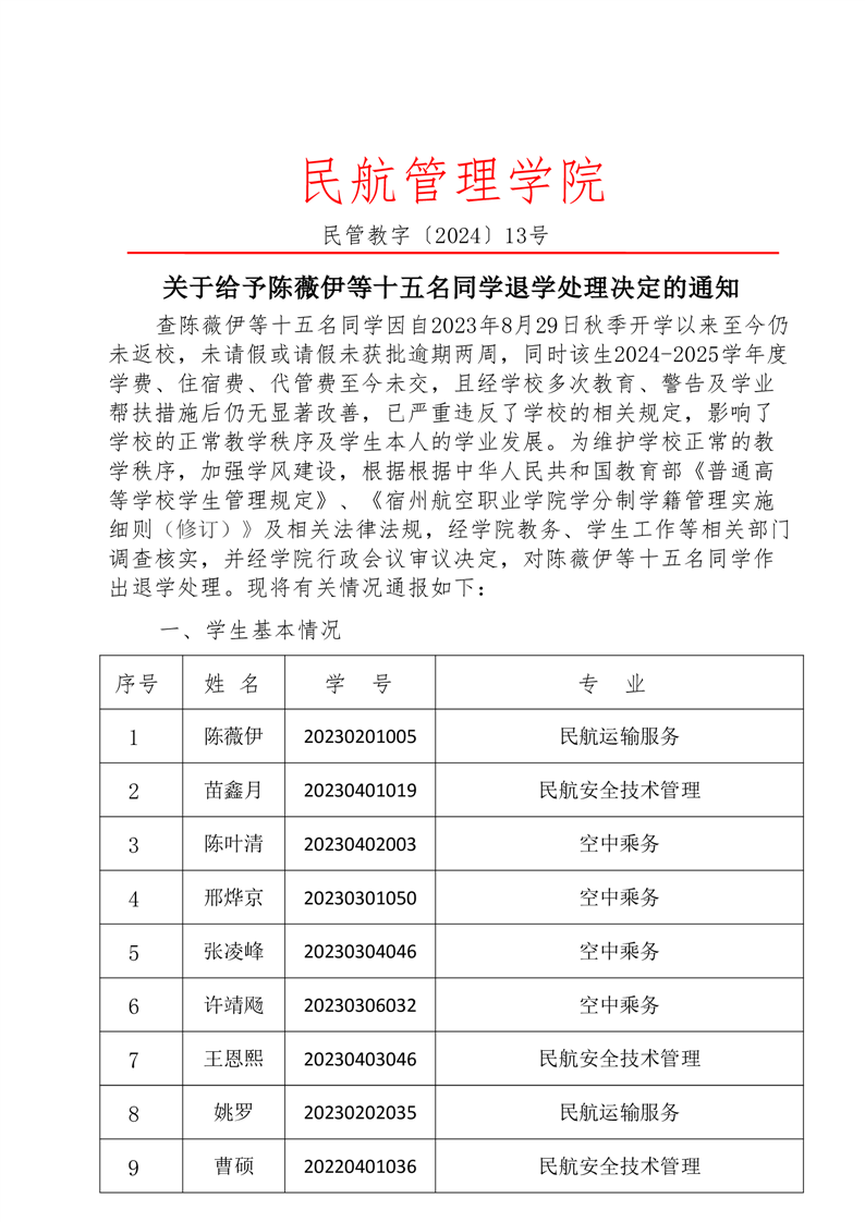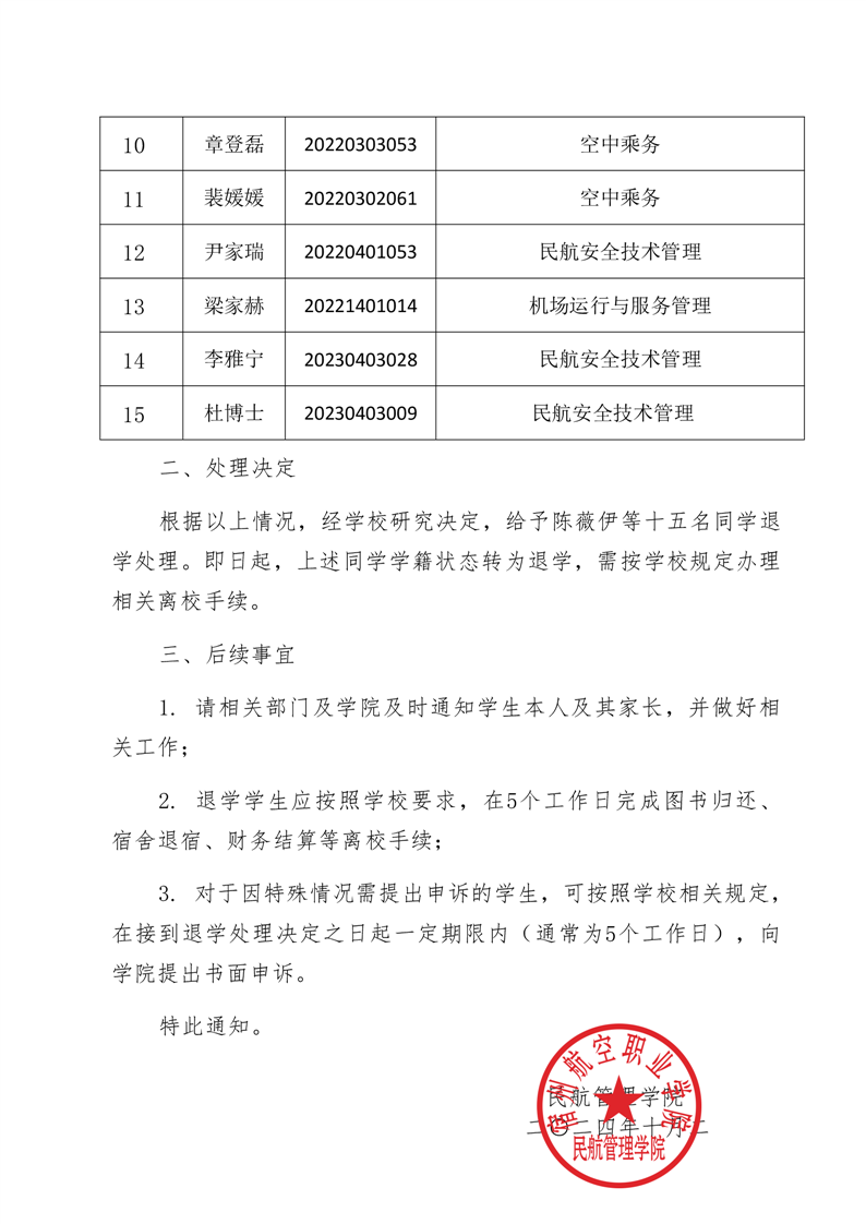 2024.10.20民航管理学院关于给予退学处理决定通知