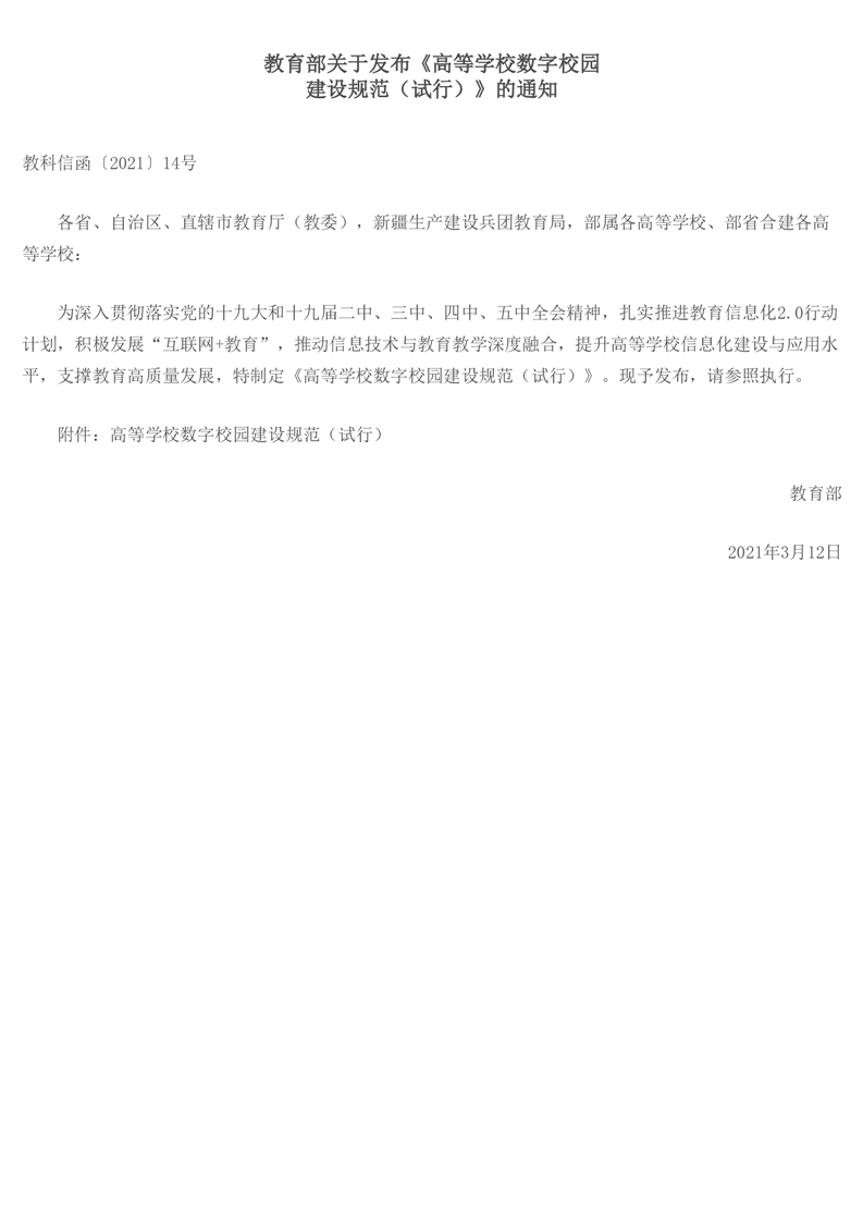 教育部关于发布《高等学校数字校园建设规范(试行)》的通知