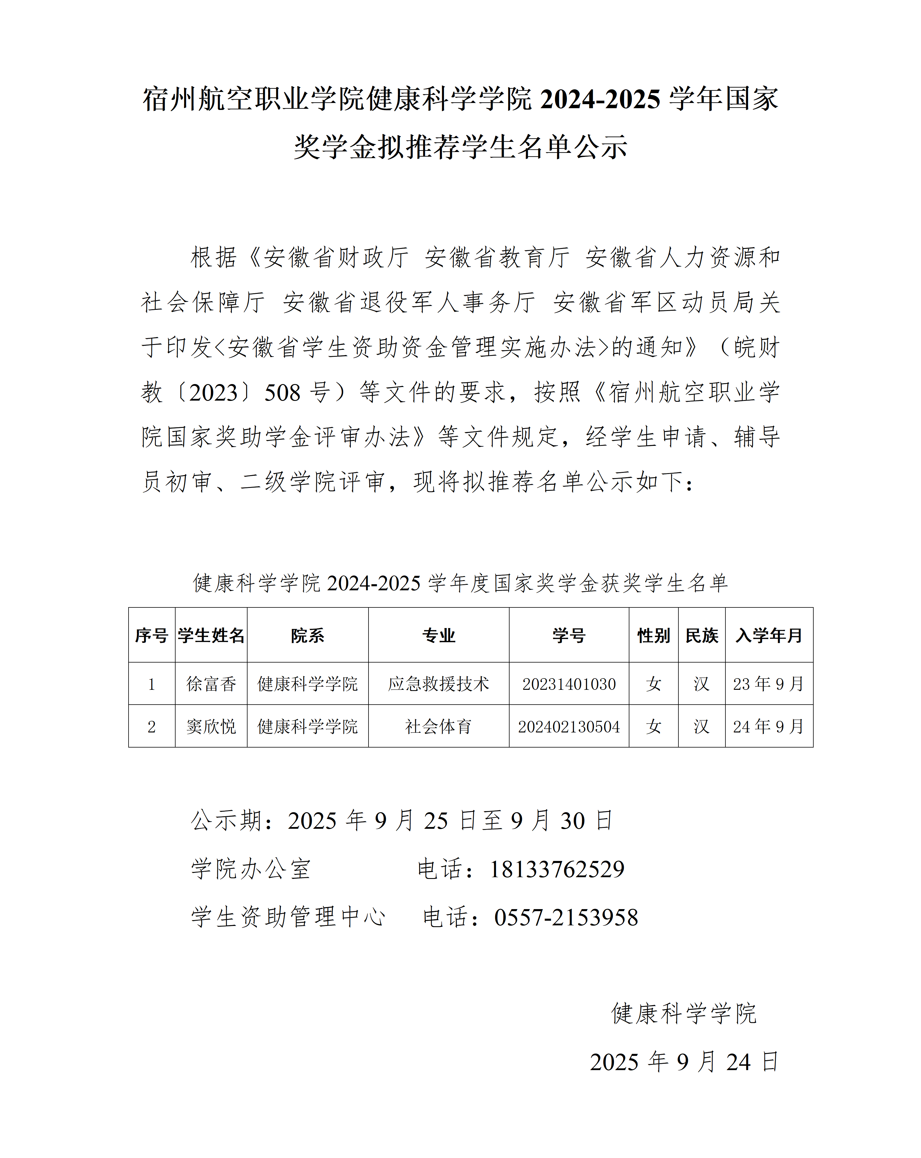 彩神Vll学院健康科学学院2024-2025学年国家奖学金拟推荐学生名单公示
